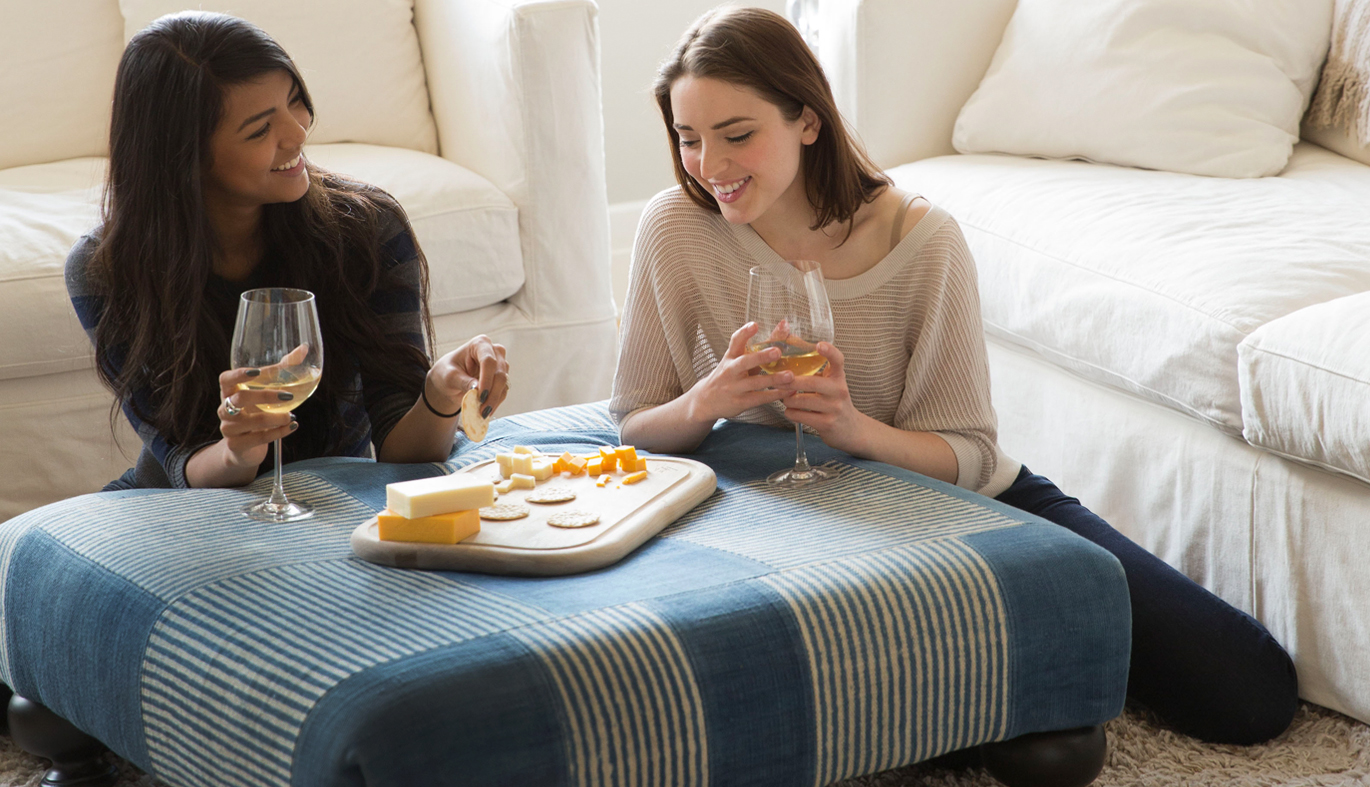 Two girls enjoying Crunchmaster crackers, cheese and wine.