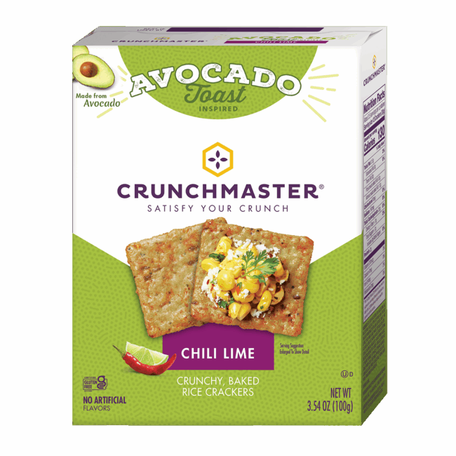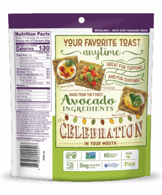 INGREDIENTS: Rice Flour, Potato Starch, Chili Lime Seasoning (Salt, Maltodextrin, Spices [Chile Pepper, Red Pepper], Sugar, Citric Acid, Lime Juice Powder [Maltodextrin, Lime Juice Solids, Lime Oil], Yeast Extract, Onion Powder, Garlic Powder, Crystallized Lime [Citric Acid, Lime Oil, Lime Juice], Natural Flavors, Extractives of Paprika (Color), Sunflower Oil), Avocado Oil*, Avocado Powder (Avocado, Maltodextrin, Modified Potato Starch, Citric Acid, Ascorbic Acid (to preserve freshness), Tocopherols (to preserve freshness)), Spinach Powder (Color), Dried Onion, Poppy Seeds, Rolled Oats, Sesame Seeds, Garlic Powder, Flax Seeds, Millet, Natural Flavor. *Adds a trivial amount of Saturated Fat.