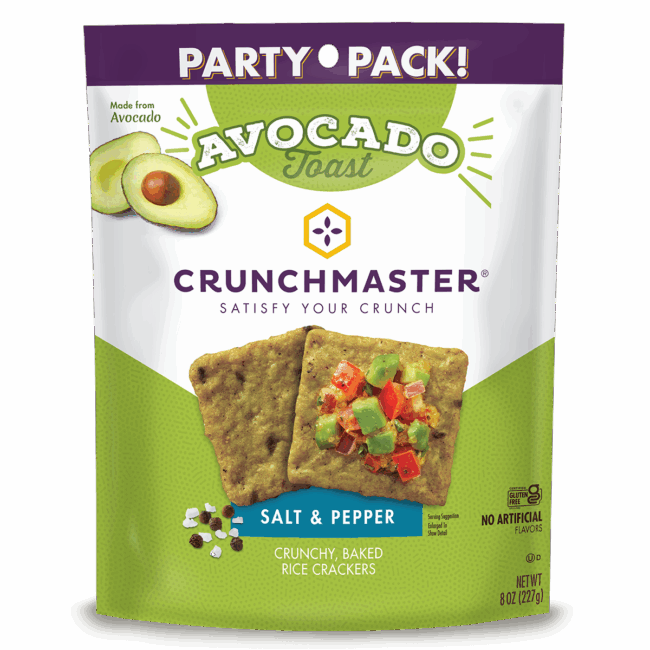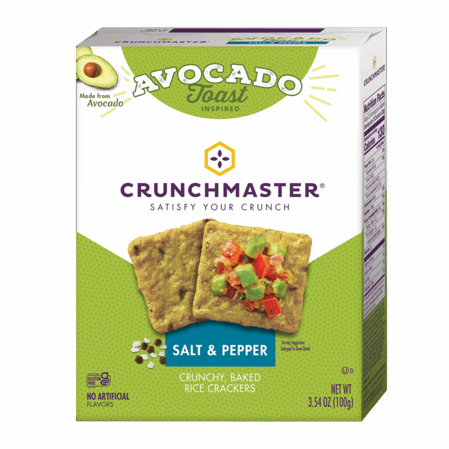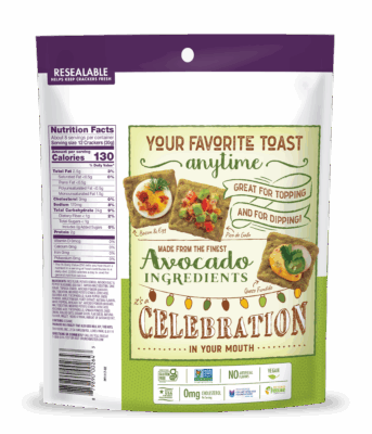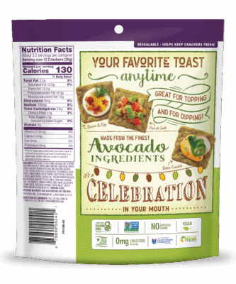 Ingredients: Rice Flour, Potato Starch, Avocado Salt & Pepper Seasoning (Sea Salt, Tapioca Maltodextrin, Cane Sugar, Tapioca Starch, Avocado Powder [Avocado, Maltodextrin, Modified Potato Starch, Citric Acid, Ascorbic Acid (to preserve freshness), Tocopherols (to preserve freshness)], Black Pepper, Onion Powder, Garlic Powder, Yeast Extract, Natural Flavors, White Pepper), Avocado Oil, Avocado Powder (Avocado, Maltodextrin, Modified Potato Starch, Citric Acid, Ascorbic Acid (to preserve freshness), Tocopherols (to preserve freshness)), Spinach Powder, Dried Onion, Rolled Oats, Sesame Seeds, Flax Seeds, Natural Flavor, Millet.