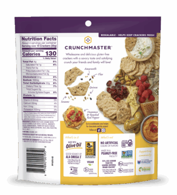 Ingredients: Brown Rice Flour, Sesame Seeds, Potato Starch, Flax Seeds, Olive Oil, Amaranth Seeds, Quinoa, Salt, Tamari Soy Sauce Powder (Tamari Soy Sauce [Soybeans, Salt], Maltodextrin, Salt).