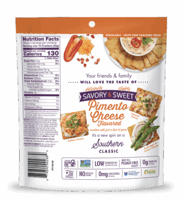 Ingredients: Brown Rice Flour, Whole Grain Yellow Cornmeal, Pepper and Cheese Seasoning (Maltodextrin, Sea Salt, Red Bell Pepper Powder, Garlic Powder, Whey, Green Bell Pepper Powder, Cheddar Cheese [Milk, Salt, Cultures, Enzymes], Roasted Garlic Powder, Onion Powder, Cane Sugar, Yeast Extract, Natural Flavor, Silicon Dioxide, Spices, Paprika Extractive {For Color}, Medium Chain Triglycerides, Citric Acid, Jalapeno Pepper Powder), Potato Starch, Sesame Seeds, Olive Oil, Organic Cane Sugar, Flax Seeds, Oat Fiber, Natural Flavors.