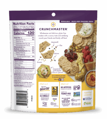 Ingredients: Brown Rice Flour, Sesame Seeds, Potato Starch, Flax Seeds, Olive Oil, Roasted Garlic Seasoning (Maltodextrin, Sea Salt, Dehydrated Roasted Garlic, Roasted Garlic Powder, Torula Yeast, Natural Flavor), Amaranth, Quinoa, Tamari Soy Sauce Powder (Tamari Soy Sauce [Soybeans, Salt], Maltodextrin, Salt).