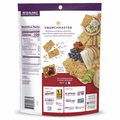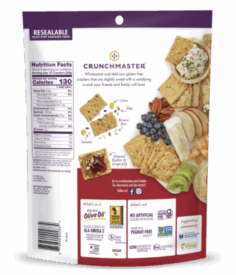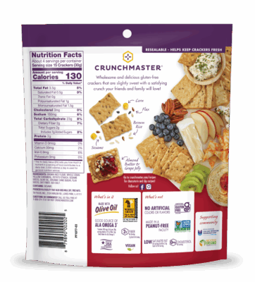 Ingredients: Brown Rice Flour, Whole Grain Yellow Cornmeal, Potato Starch, Sesame Seeds, Olive Oil, Organic Cane Sugar, Flax Seeds, Oat Fiber, Sea Salt.